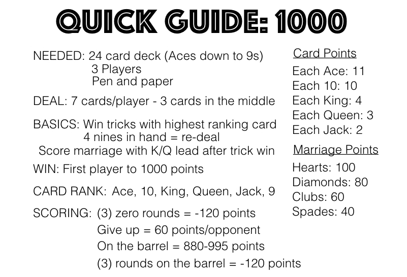 This combination of trick-taking and strategic use of high-value card pairs makes the pursuit of reaching 1000 points both challenging and engaging.