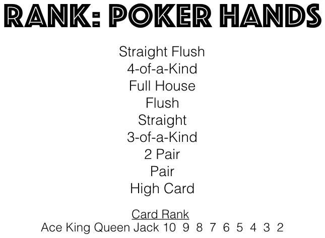 Highest to lowest - Ace, King, Queen, Jack, 10, 9, 8, 7, 6, 5, 4, 3, 2