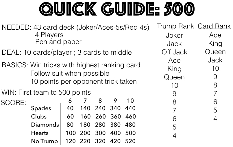 500 is a fun trick-taking card game. Be the first team to 500 points to win this game! Find the video tutorial and written explanation for how to play 500 below. Be sure to check out the quick guide to help you learn as you play.