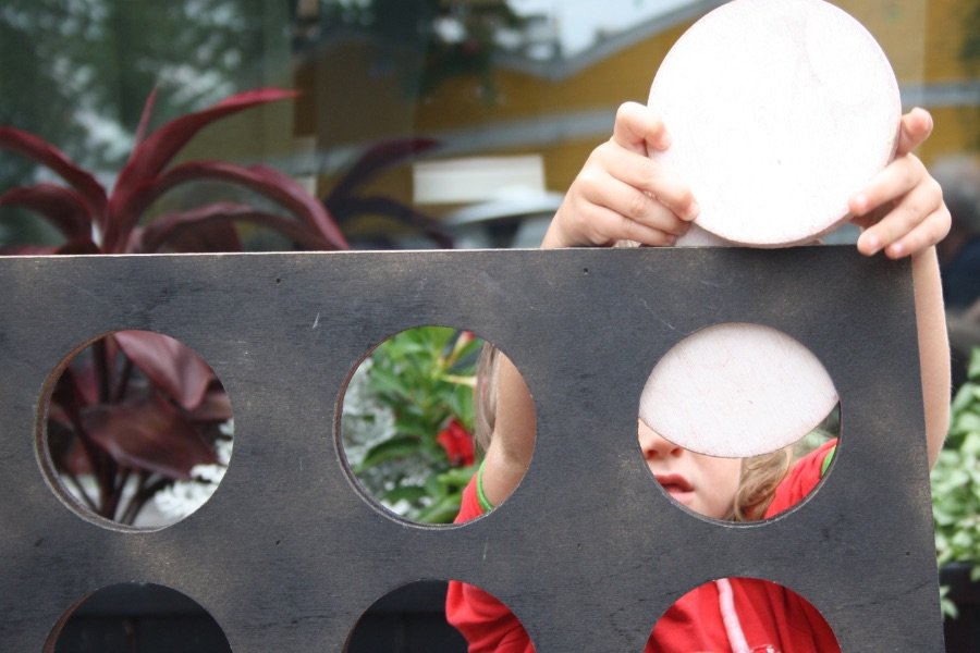 The oversized checkers pieces demand physical engagement as players stretch and reach to maneuver their way to victory by capturing opponents' pieces.