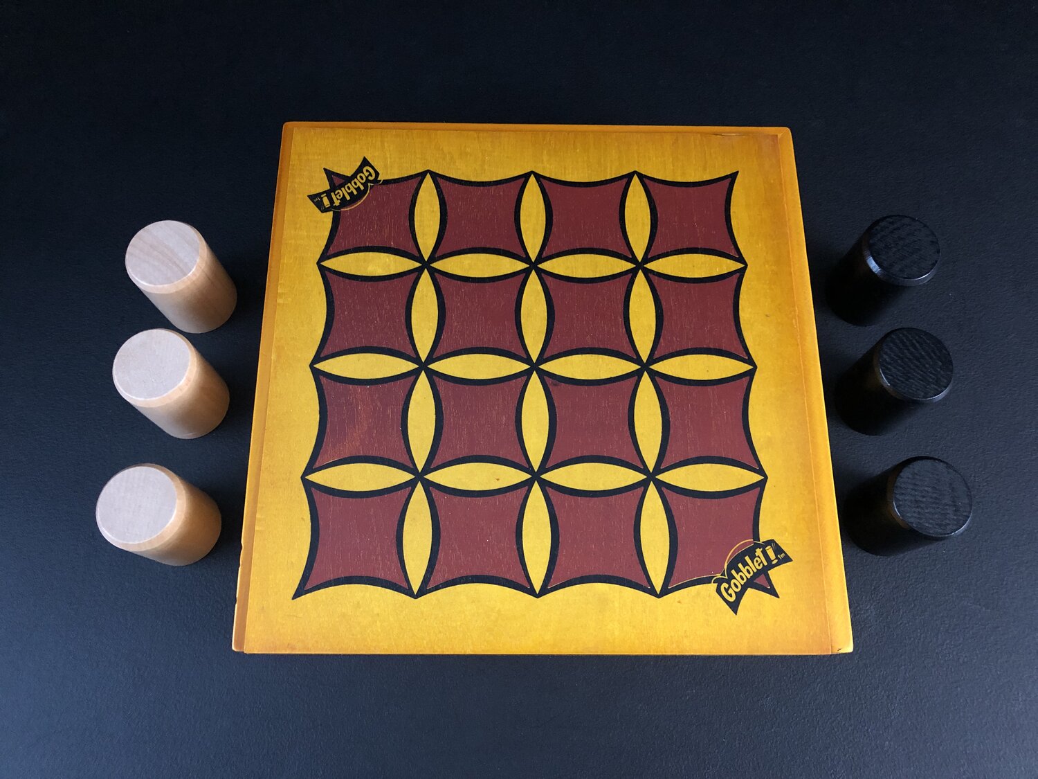When an opponent has three gobblets in a row, a player is allowed to gobble up one of the three gobblets with an external gobblet.