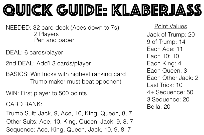 Find the video tutorial and written explanation for how to play the card game klaberjass below. Be sure to keep the klaberjass quick guide close while playing for a quick reference to help you learn as you play.