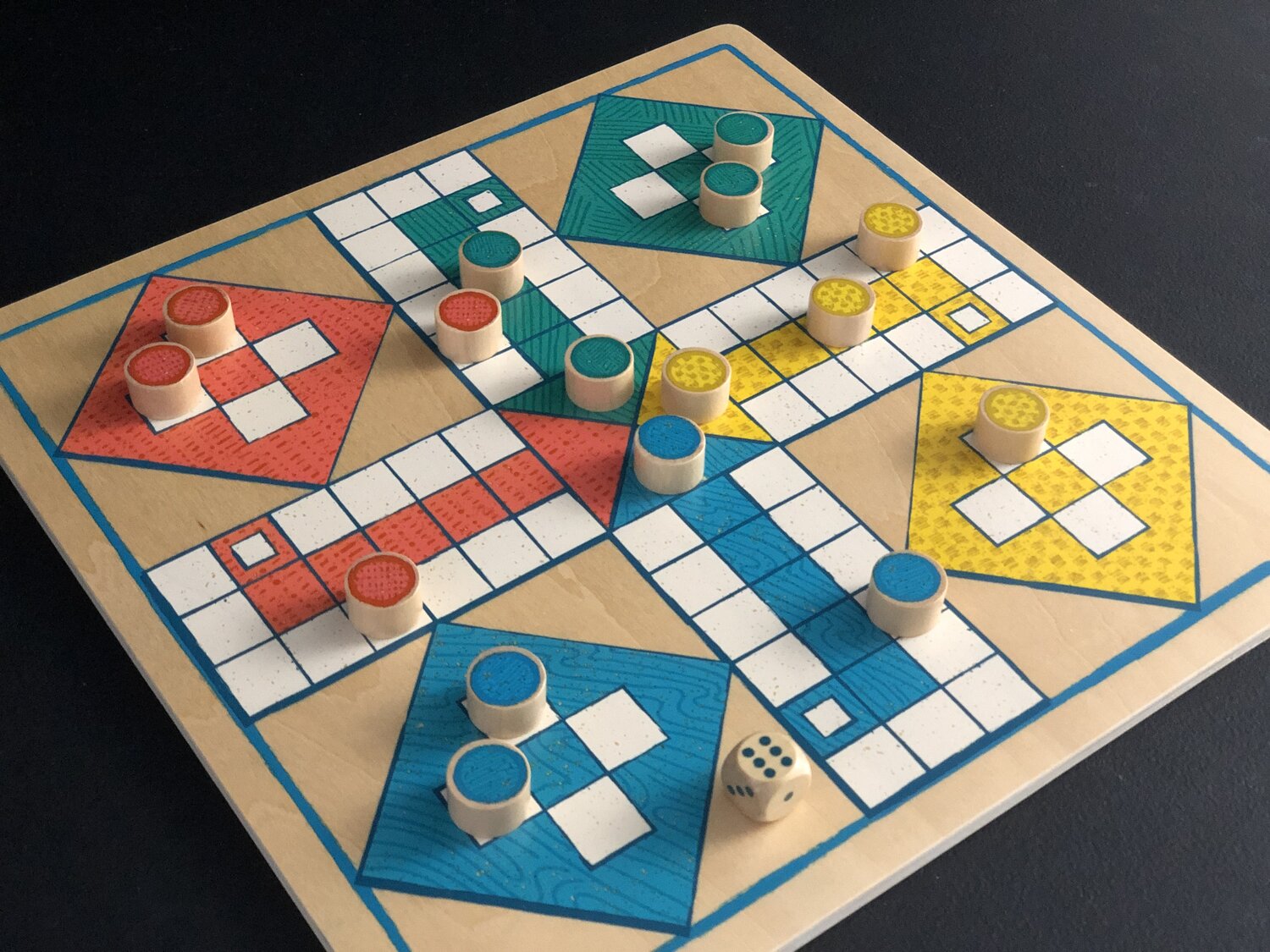 When a piece has made it all the way around the board it will enter its home column toward the finishing square. A piece can only enter the finishing square by exact roll. The first player to get all their game pieces into the finishing square wins the game.