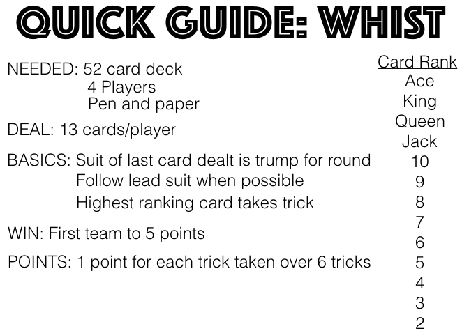 Whist is a fun, easy to learn trick-taking card game. The goal of this game is to win more tricks than your opponents.